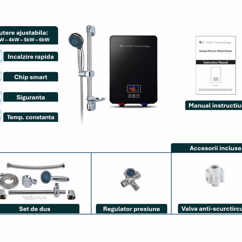 Încălzitor instant electric pentru apă (6 kW) cu afișaj LCD, protecție IPX4 și termostat cu siguranță dublă.