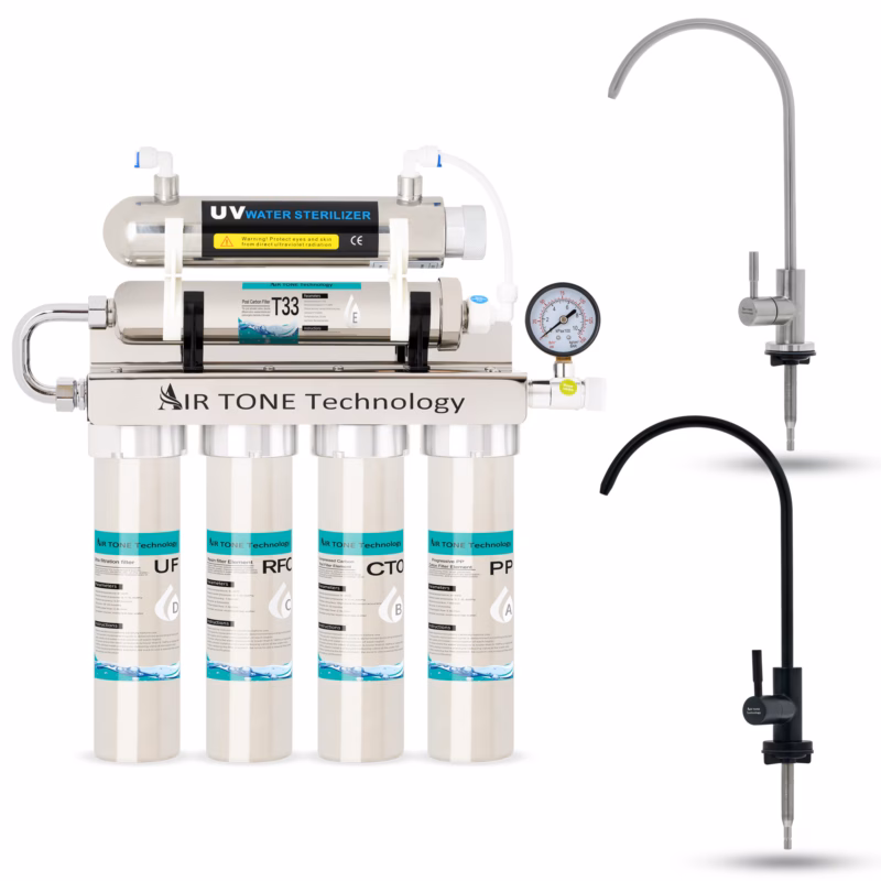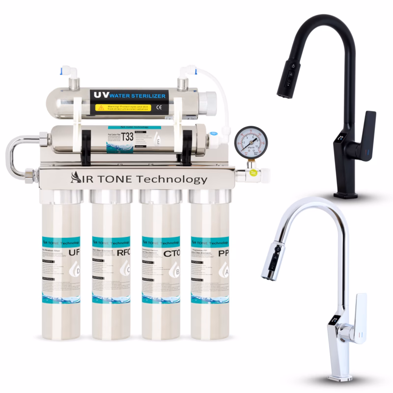 Sistem profesional de filtrare in 6 etape cu lampă UV-6W, care reține particule până la 0.01 μm și neutralizează bacteriile. Carcasă inox, debit 90 L/h, montaj flexibil sub chiuvetă/perete/blat. Include robinet 3 căi, accesorii și cartușe de schimb pentru apă sigură, pură și cu gust excelent.
