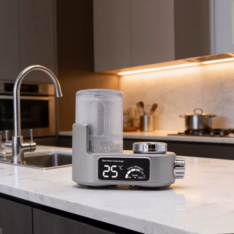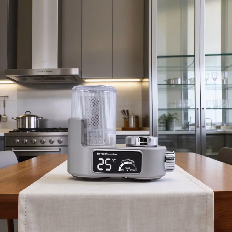 Filtru apă pe baterie (Gri) cu 8 etape de filtrare, afișaj LED (temperatură & durată de viață cartuș), UV albastră și hidrogenerator fără baterii.