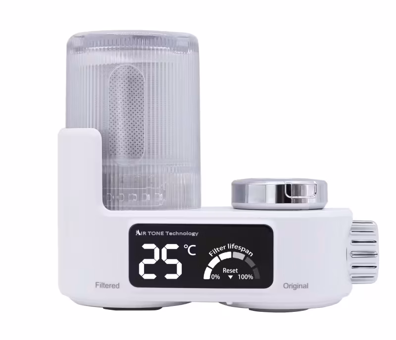 Filtru apă pe baterie (Alb) cu 8 etape de filtrare, afișaj LED (temperatură & durată de viață cartuș), UV albastră și hidrogenerator fără baterii.
