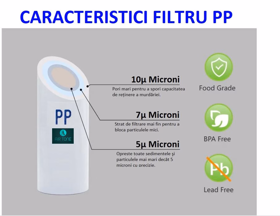 Cartuș PP 5 µm din polipropilenă 100% (fără aditivi) pentru sedimente: nisip, nămol, rugină. Compatibil Air Tone Technology. 4000 L, 90 l/h, 4 bar, 10–40°C. Înlocuire orientativă 3–6 luni.