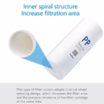 Cartușul PP (polipropilenă) este prefiltrul mecanic al sistemului tău, conceput să rețină sedimentele (nisip, nămol, rugină, particule solide) pentru a proteja etapele fine (CTO/RFC/UF/T33) și pentru a menține debitul și performanța optimă.