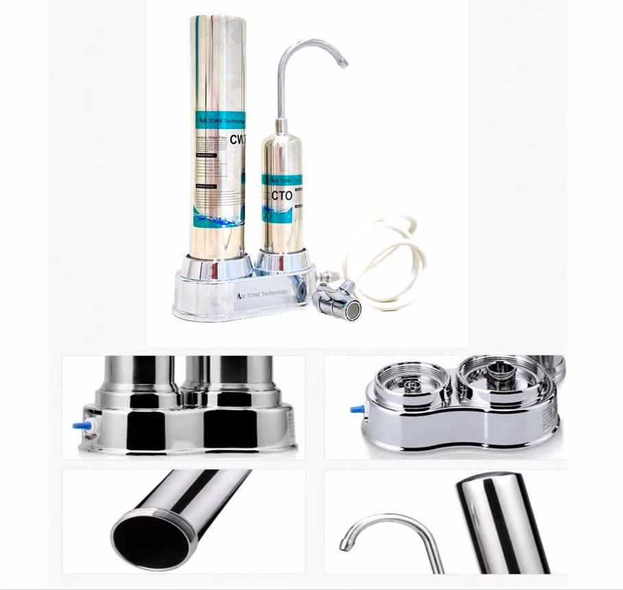 Filtru apă Air Tone AquaSafe (inox) – 2 etape de filtrare (ceramică + carbon de cocos), capacitate 4000 L și montaj în 2 minute, fără găurire. Comutare instant între apă filtrată/nefiltrată, compatibil cu majoritatea bateriilor. Cartușe incluse, autonomie 6–12 luni. Apă curată, gust îmbunătățit, economii reale.