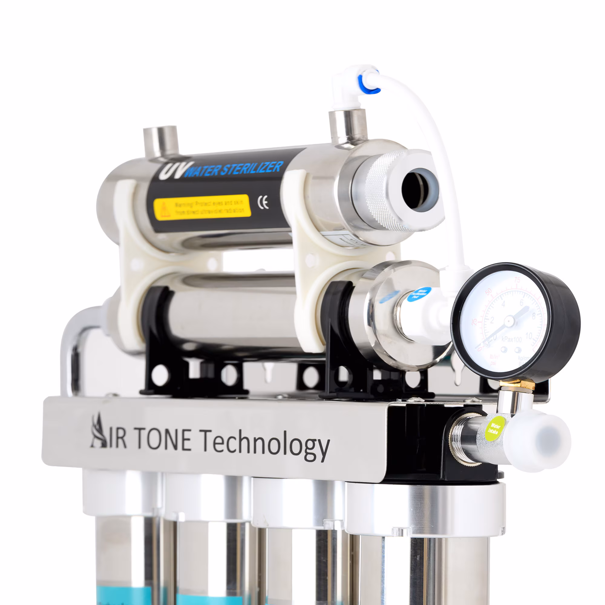 Sistem profesional de filtrare al apei Air Tone Technology cu carcasă din inox 304, 6 etape de purificare și lampă UV antibacteriană UV-6W pentru apă sigură, clară și cu gust natural, direct la tine acasă. Montaj rapid, sub chiuvetă, pe perete sau pe blat, cu robinet dedicat și toate accesoriile incluse.