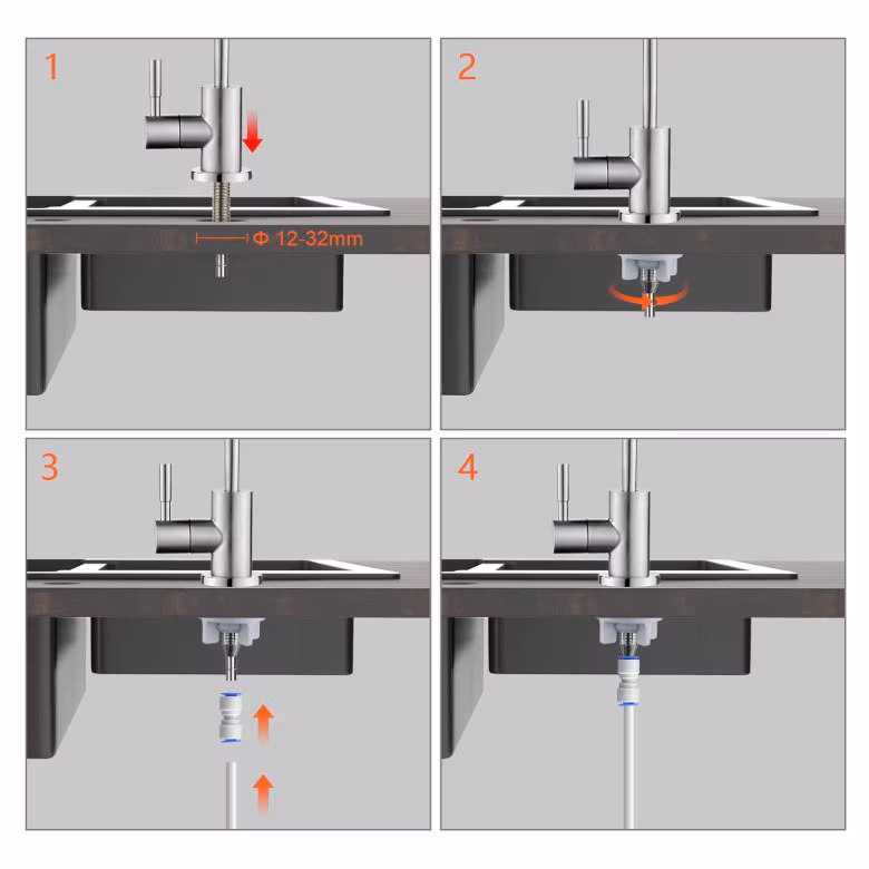 Da, kitul include racorduri standard și robinet dedicat; se montează sub chiuvetă/perete/blat.
