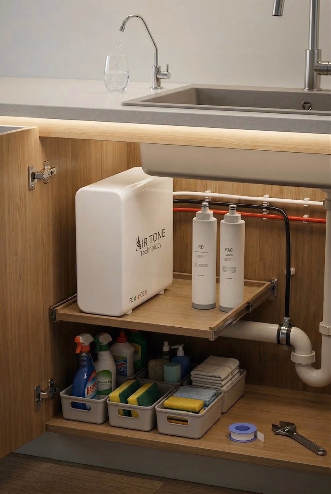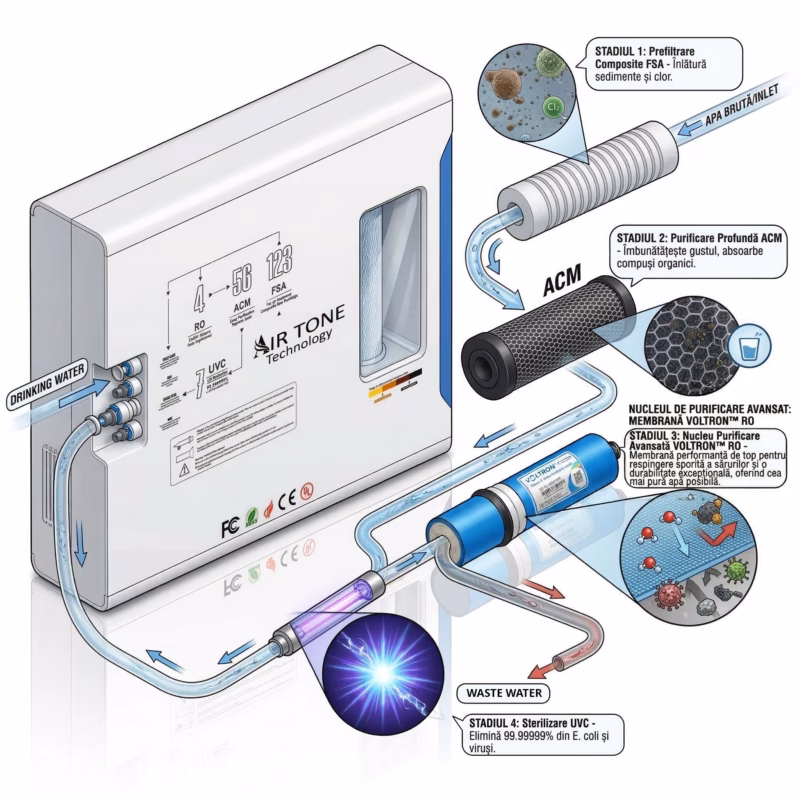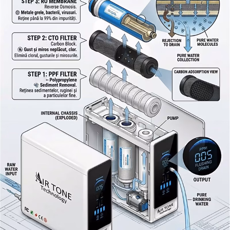 Filtru apă sub chiuvetă Air Tone Technology – carcasă din inox 304, 5 etape (PPF, CTO, RFC, UF, T33), 0.01 microni, debit 90 L/h, robinet dedicat inclus.