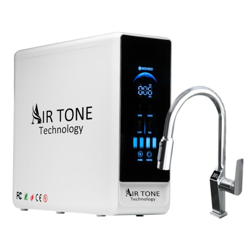 Filtru Apa cu Osmoza Inversa 600GPD, AirTone Technology, Display Digital TDS & Status Filtre, 5 Stagii Filtrare, Fara Rezervor, Auto-Clean, Sistem Compact Desktop, 0.0001 microni, Baterie cu 3 cai Afisaj temperatura apa