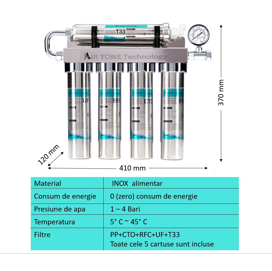 Filtru de apă Air Tone Technology, Inox, 5 stagii de filtrare, 0.01 microni – Fara Robinet