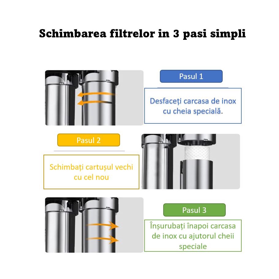 • Cartușe de schimb disponibile permanent: se pot înlocui ușor, asigurând o filtrare constantă.