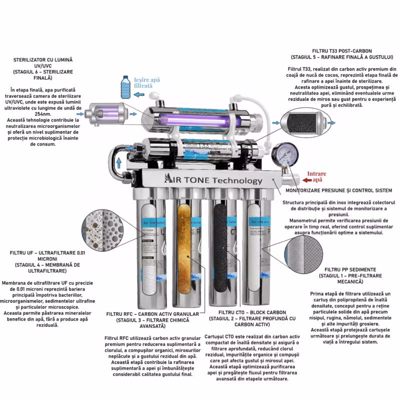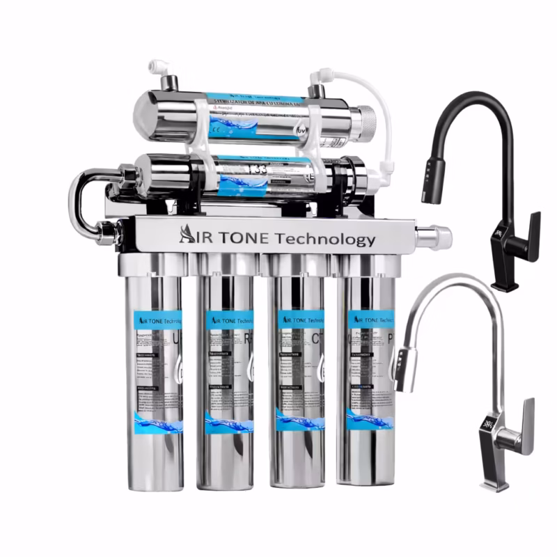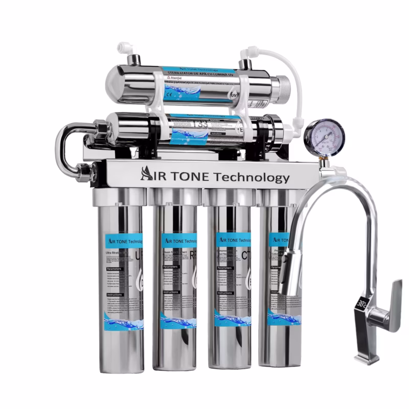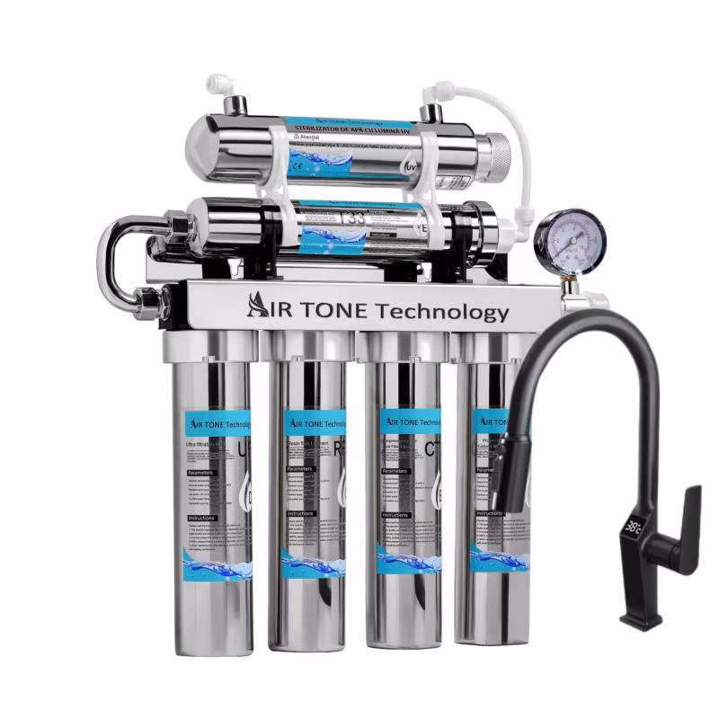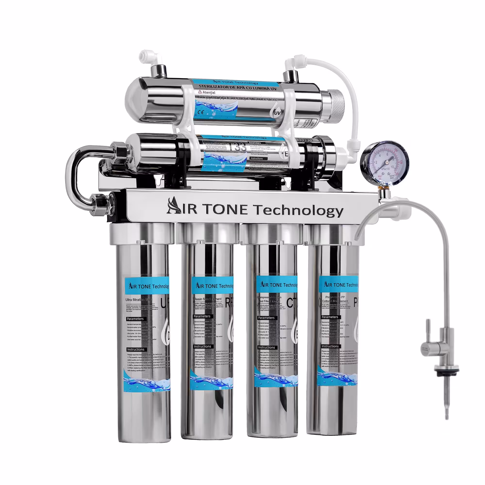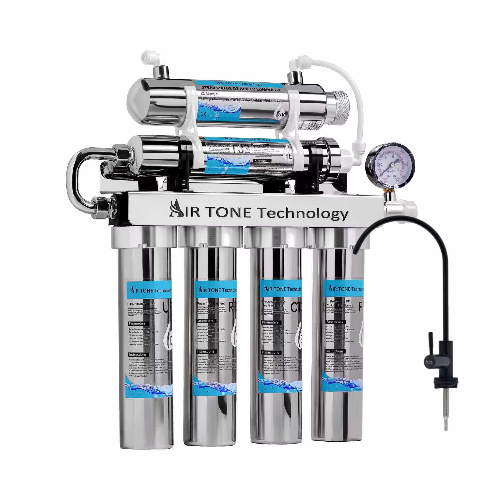 Sistem profesional de filtrare al apei Air Tone Technology cu carcasă din inox 304, 5 etape de purificare și lampă UV antibacteriană UV-6W pentru apă sigură, clară și cu gust natural, direct la tine acasă. Montaj rapid, sub chiuvetă, pe perete sau pe blat, cu robinet dedicat și toate accesoriile incluse.