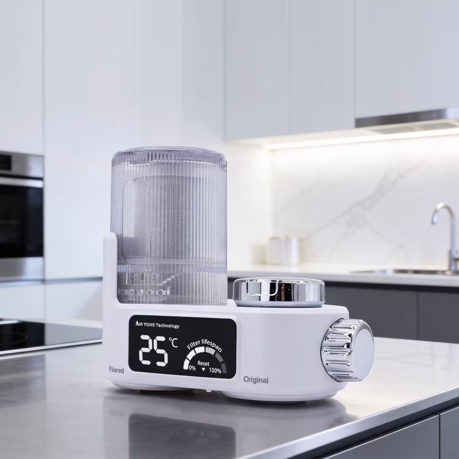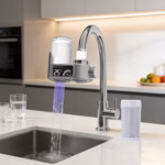 Filtru apă pe baterie (Alb) cu 8 etape de filtrare, afișaj LED (temperatură & durată de viață cartuș), UV albastră și hidrogenerator fără baterii. Conține: 1× filtru pentru robinet + 2× cartușe de rezerva