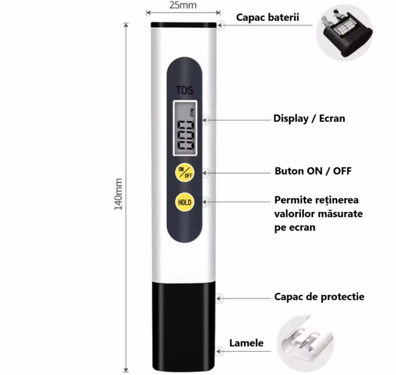 Notă: Testerul TDS nu identifică bacterii sau contaminanți specifici; măsoară totalul solidelor dizolvate. Pentru analize microbiologice/chimice detaliate, apelați la un laborator specializat.